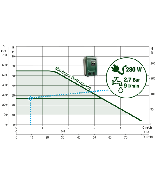 Operating range: capacity up to 80 l/min; head up to 55 m