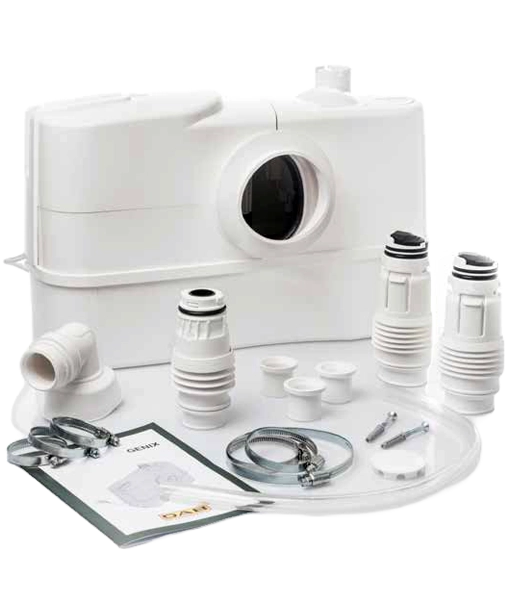 Supplied complete with fittings with non-return valves integrated, hose clamps, hose adaptors, ground-fixing screws, anti-vibration rubber nubs, and illustrated quick guide