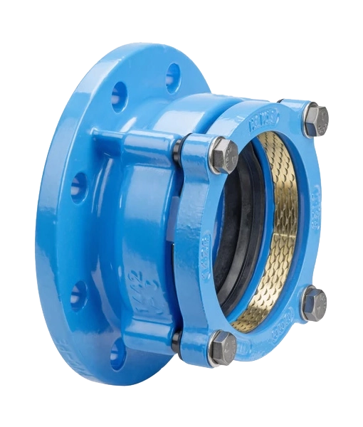 Ductile iron flange adaptor with push socket for high-tensile restraint connection for PE and PVC pipes, available in sizes from DN50 to DN300.