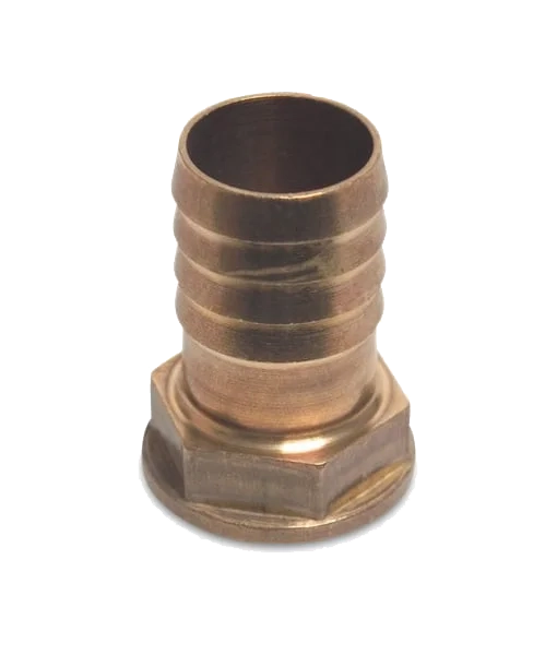 Brass hose tail with barbed fitting to female BSP thread for connecting layflat or suction hose.