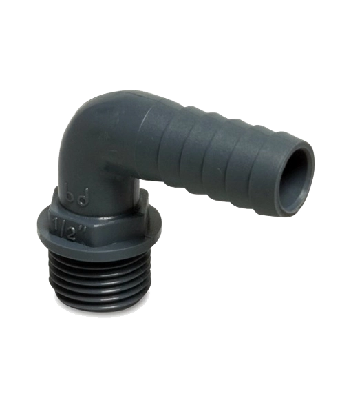 Male plastic hose tail moulded from PP with barb to male BSP threaded elbow for connecting layflat or suction hose to a submersible pump.