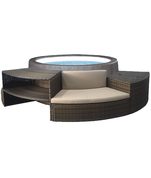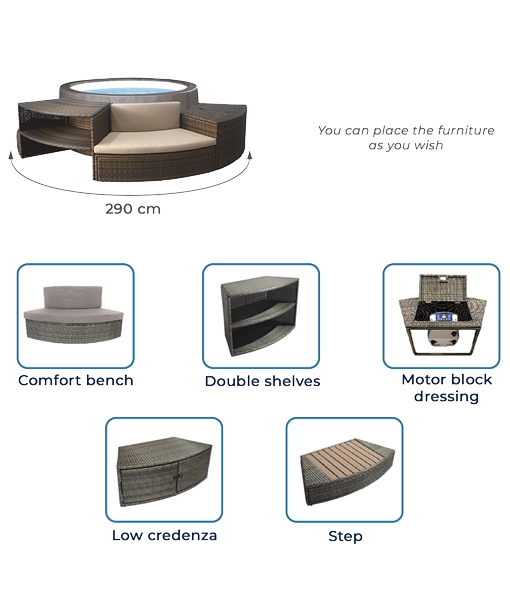 The five piece furniture set includes a cabinet to hide the backdrop or engine block, a shelf for towels, an access step and a bench with cushions to extend your relaxation time outside the spa.