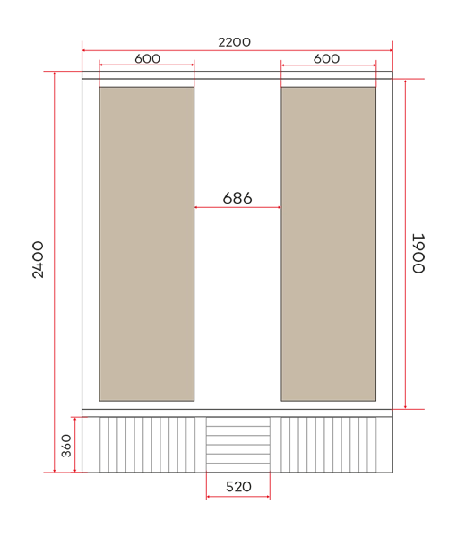 Twin facing deep double benches (60cm raw pine), and a terrace with two seats