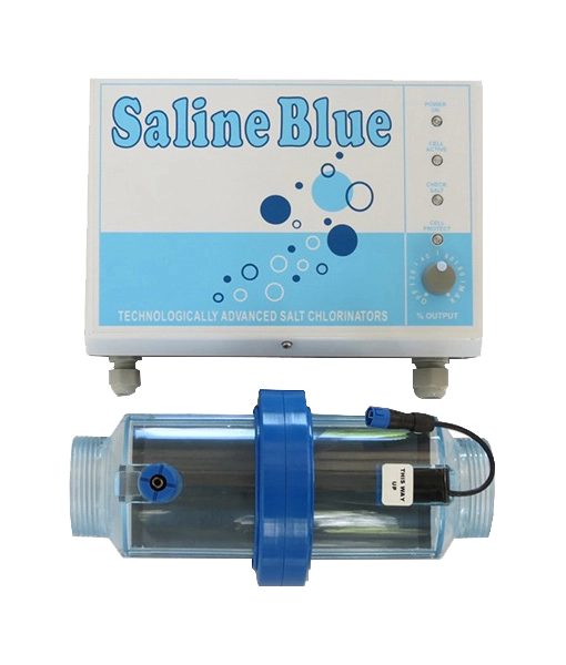 The Saline Blue works by producing chlorine in low concentrations whenever the pump and filter is running, chlorine is produced by electrolysis of the pool water as it flows through the cell and returns to the pool.